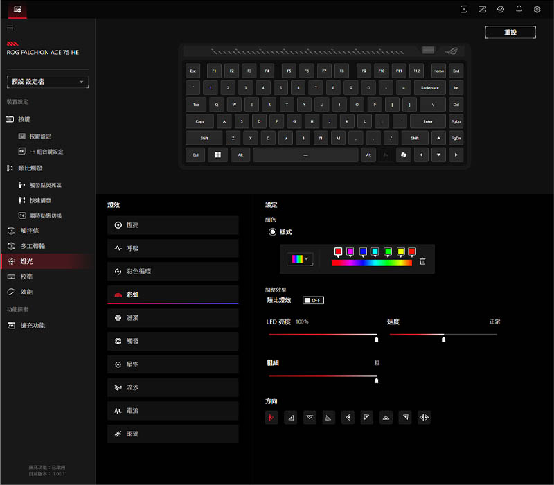 燈效部分預設就提供了 10 種不同的模式供玩家切換,從經典的呼吸燈、彩虹循環,還有跟隨按鍵觸發的動態效果應有盡有。