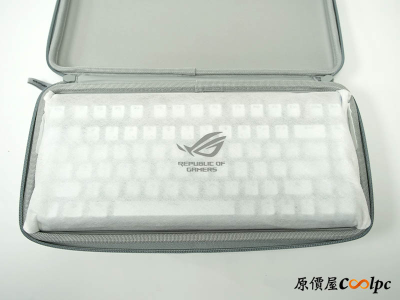 (點圖放大)內附的硬質便攜保護包質感很不錯,外層用的是滑順的佳績布材質;這裡有個小細節,黑色款附的是黑色包,而我們這次開箱的白色款則是搭配淺灰色唷!打開包包後,會看到鍵盤本體還有用布質收納袋保護著,這保護做得很夠!底下則是有針對拔軸器、連接線與說明書設計的專屬收納槽,不管是出國比賽還是去朋友家網聚,直接一包帶走就搞定,對有外出需求的朋友來說非常方便。