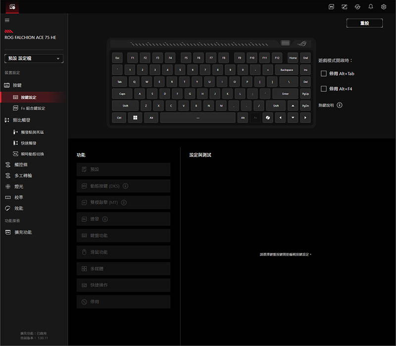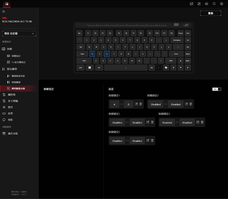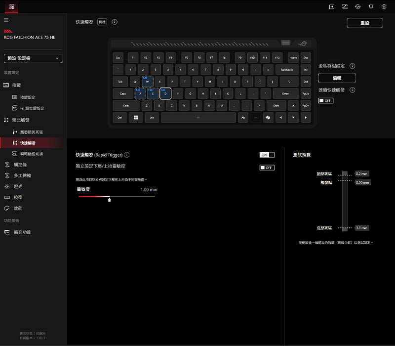 (點圖放大)類比觸發分頁是整把磁軸鍵盤的核心命脈,也是玩家們最關心的重頭戲。這裡包含三大核心功能:觸發點與死區、快速觸發 (Rapid Trigger) 以及順時動態切換 (Speed Tap)。憑藉著 0.01mm 級的極致微調精度,你可以在 0.1~3.5mm 範圍內依照個人手感與遊戲需求自由設定。看是要追求極速發動,還是要紮實的反饋感,這把鍵盤的極高自由度,就交給各位玩家去盡情發揮了!