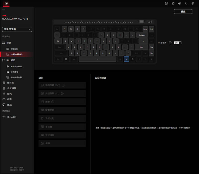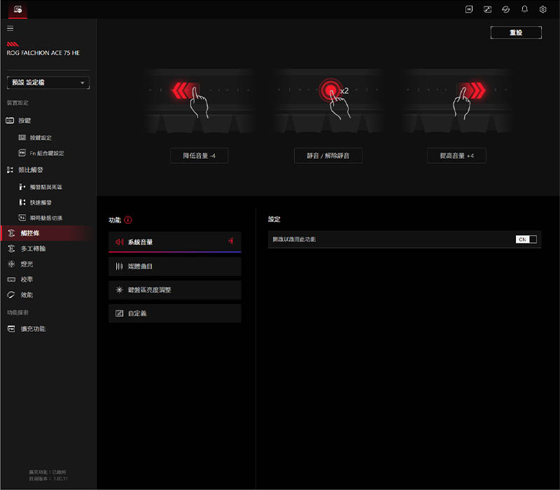 (點圖放大)鍵盤上方的觸控條與轉輪同樣支援功能自訂。雖然目前兩者的分工非常明確,但小編微小的願望是,希望未來華碩能透過更新,讓兩邊的可選功能完全整合在一起自訂!這樣一來玩家在左右手配置上的靈活性一定會更高,操作也會更隨心所欲!