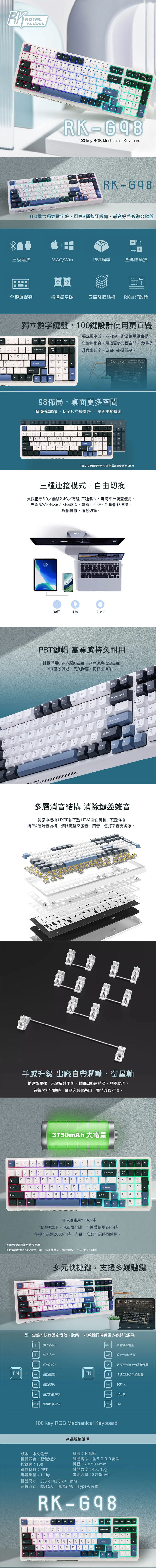 【活動商品】:Royal Kludge G98 三模機械式鍵盤/有線/無線/藍牙/黃軸/中文/熱插拔, $2390 ↘ $2111