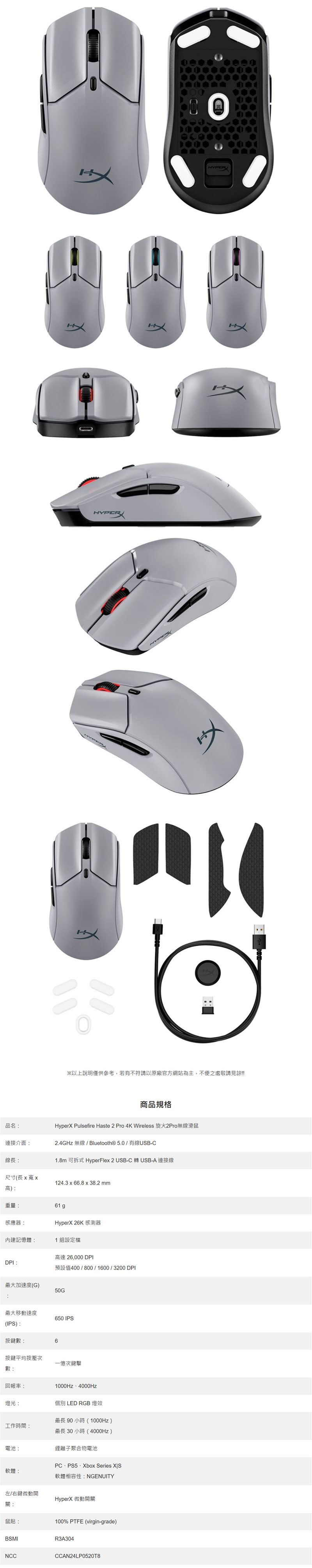 .HyperX Pulsefire Haste 2 Pro 4K 無線滑鼠(灰)(A1KY5AA) $3890↘$2990