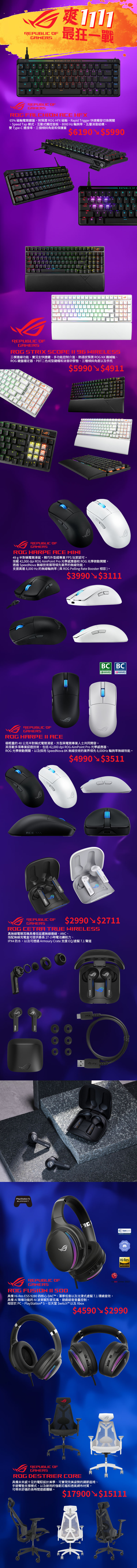 再來說說人氣爆棚的 ROG Strix Scope II 96 無線機械式鍵盤,現在可是直接大砍一千,黑白雙色、青紅雙軸一次齊發!96% 佈局兼具完整功能與節省桌面空間,三模連線自由切換,支援 2.4 GHz、藍牙與 Type-C,RX 光軸回饋乾脆、手感穩定還防塵防晃,長時間打字或遊戲都相當舒適。玩家一致好評的手感現在正是入手時機!優惠的兩款滑鼠也是必收,Harpe Ace Mini 只有 49g,輕到幾乎感覺不到重量,但卻塞進 36,000 DPI 感測器與 8000 Hz 輪詢率,甩槍順狙行雲流水,重點是原價快四千現在也降價到三千出頭,超級優惠;想追求更進階可考慮 Harpe II Ace,因為更快速的 42,000dpi 才跟上你的神手,外觀設計更加圓潤飽滿,手感也更好,這次優惠更是狂降千元,最優惠肯定選它!若跟 Falchion Ace HFX 搭在一起簡直是打片天下無敵手啊!