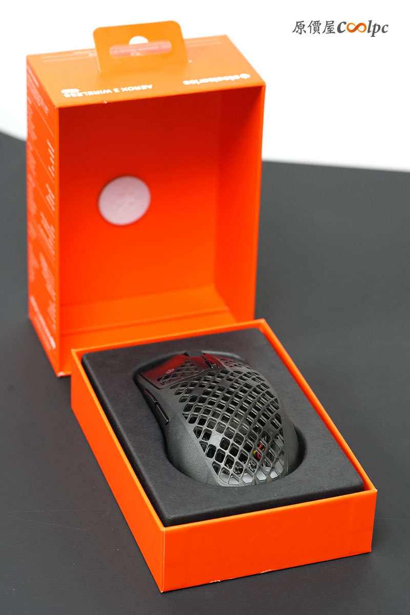 掀開上蓋後滑鼠本體安穩躺在盒內,因為外包裝也採用硬盒設計,所以對滑鼠的保護性算是做得不差。