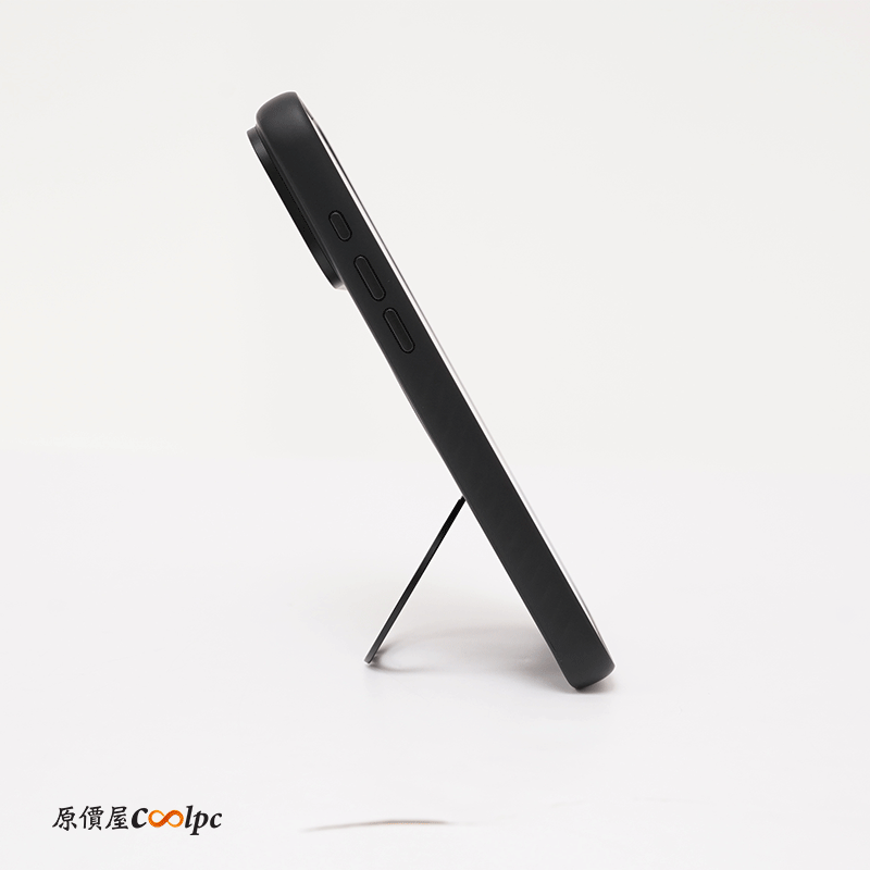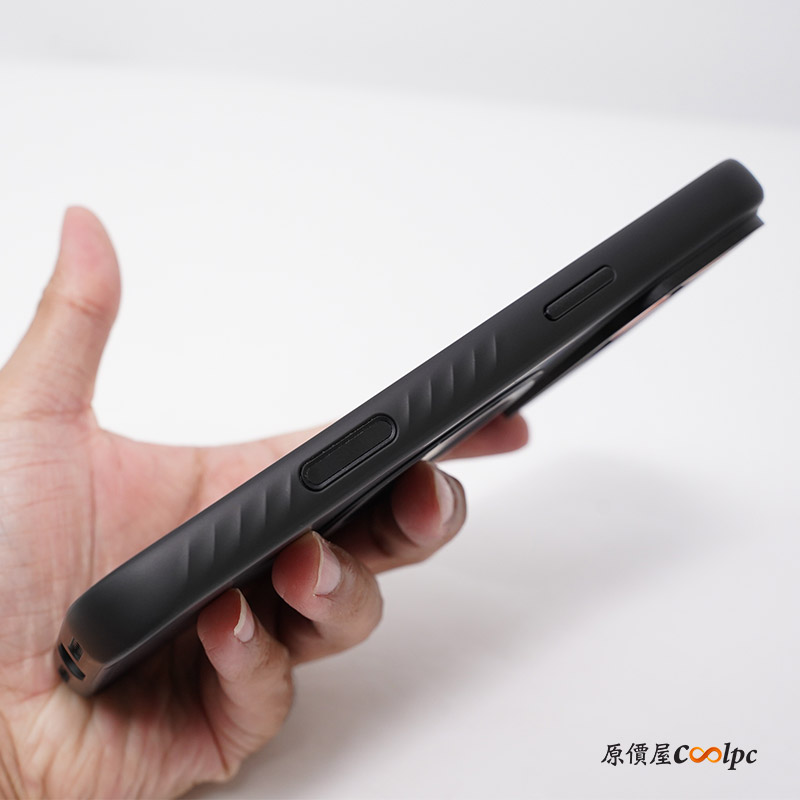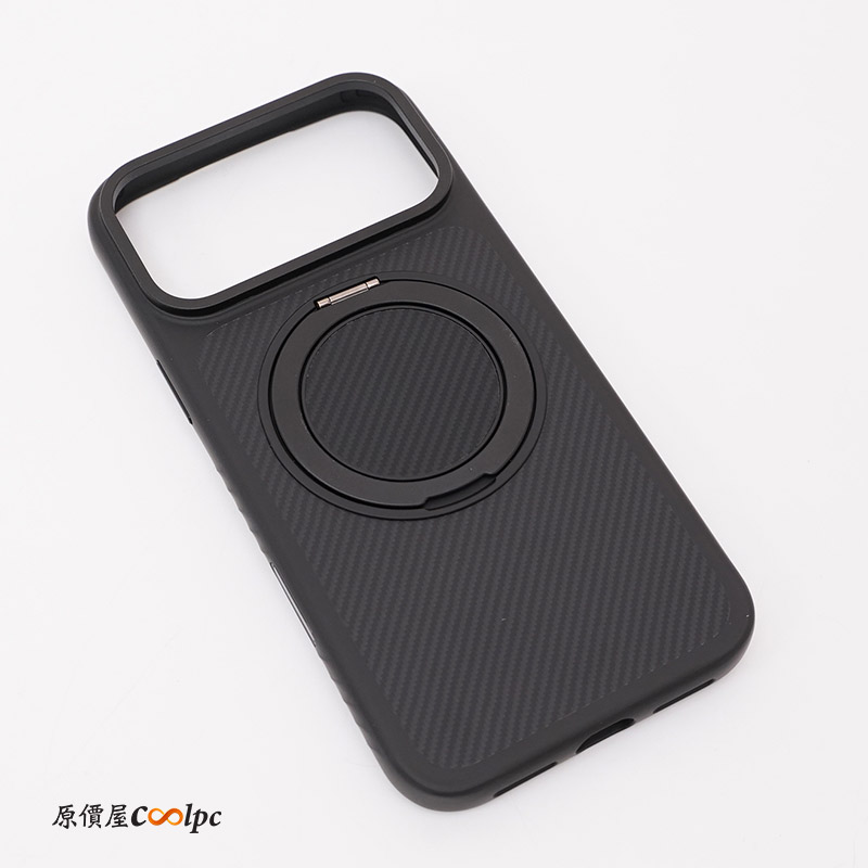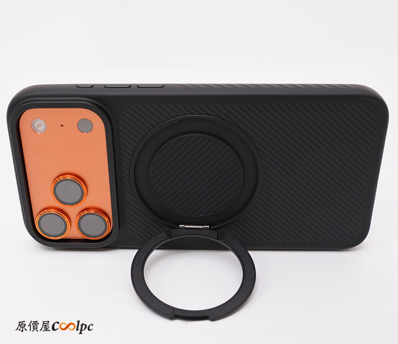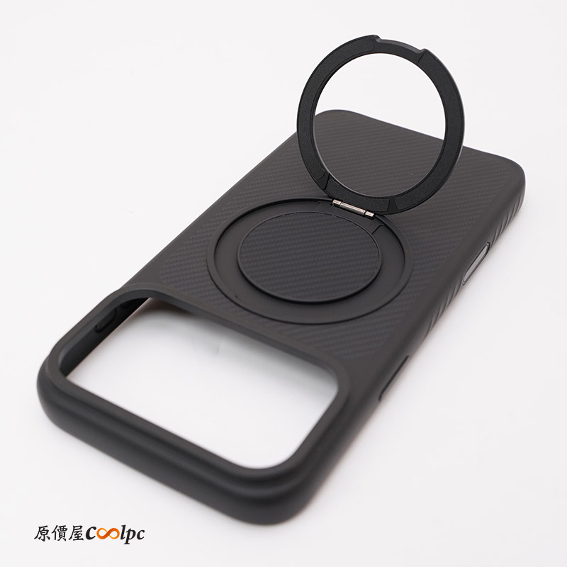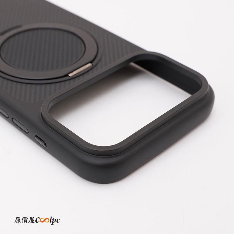 手機殼採用 TPU(熱塑性聚氨酯)製成,底部可以看到克維拉纖維圖案,那塊真的超級無敵硬,保護手機背板絕對沒有問題。背後還有一個可 360 度旋轉的支架,旋轉還會有喀喀聲,支援橫向與縱向模式站立。