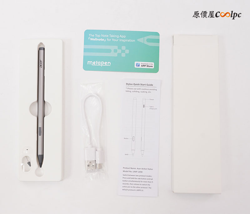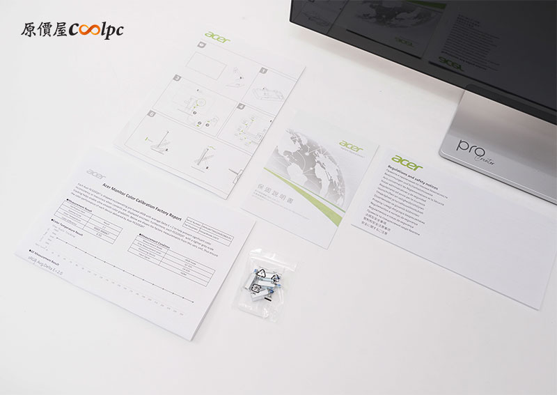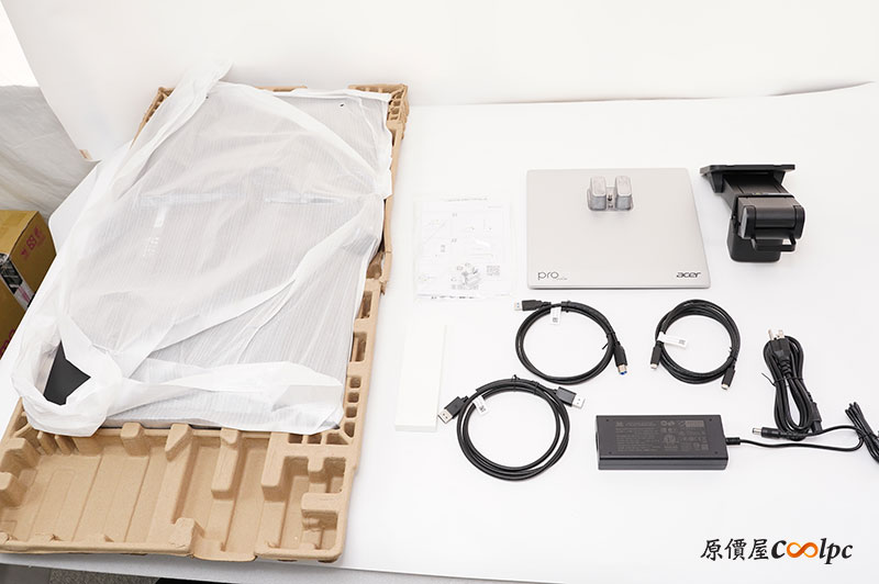盒子內所有的配件有螢幕本體、保固卡、安裝指南、顏色校準報告、觸控筆與充電線、變壓器、DisplayPort 1.4 線材、Type-C 線材、USB-A to USB-B線材。如需壁掛,請使用專屬螺絲。內附支援多點觸控的主動式手寫筆(需充電)。