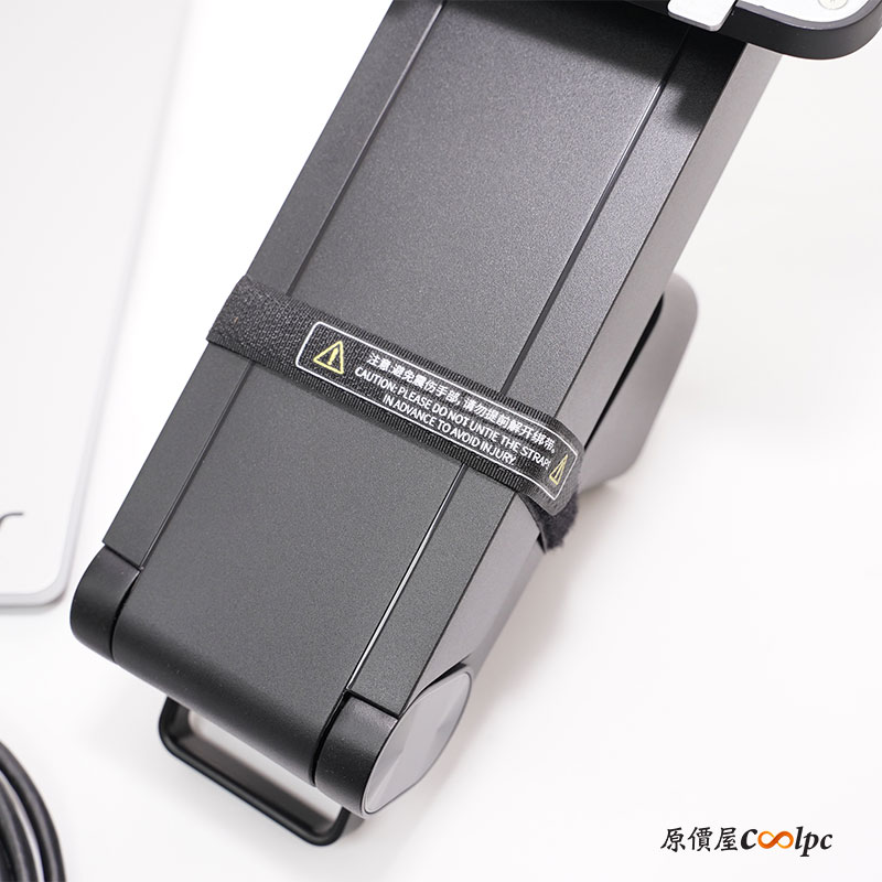 acer PE320QXT 創作者螢幕的支架設計較為特殊,安裝方式亦不同,建議安裝前參閱說明書流程,以避免操作不便。支架上附有警示標語:「避免夾傷手部,請勿提前解開綁帶」。