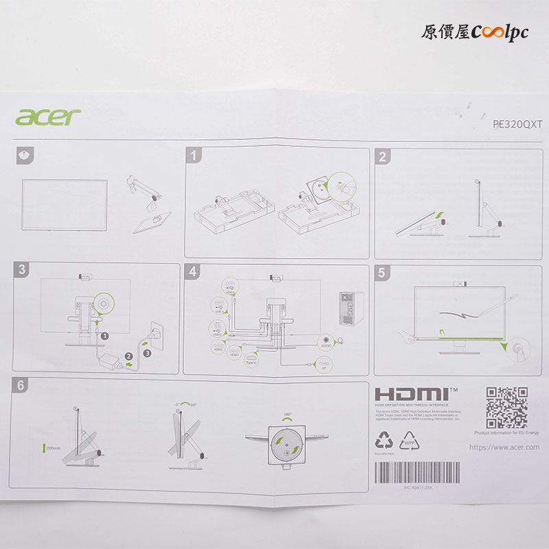 外盒側面可以看到螢幕實體示意圖,是 acer 最新的 ProCreator 創作者系列螢幕,32 吋 6K 解析度的規格!側面的型號是 PE320QXT,底下則是螢幕特色簡介,像是剛提到的 6K (6016 x 3384)、IPS 面板、10 點觸控、 99% Adobe RGB、DCI-P3 99%、Delta E<1、Calman VERIFIED 與 VESA CERTIFIED DisplayHDR 600 認證,以及紙類回收標誌。外箱與內襯採用可回收紙類包材,可重複利用,從而減少對環境的影響。