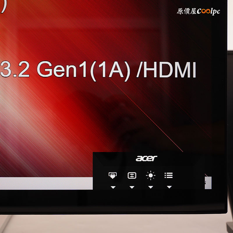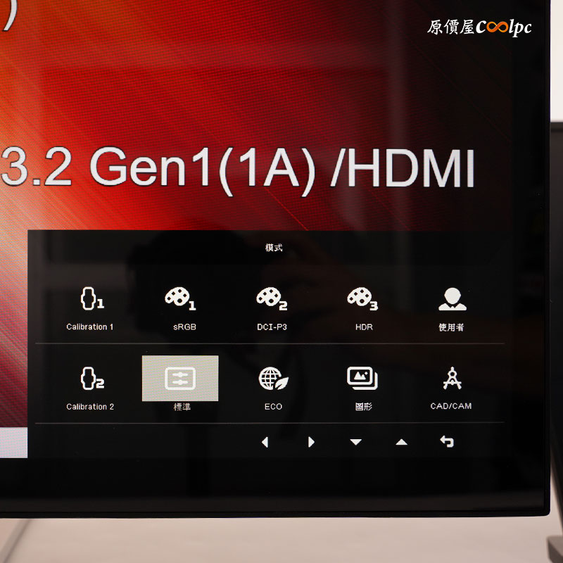 對應剛剛螢幕底下的快捷鍵,從左至右分別是輸入源切換、模式切換、亮度調整、功能選單。