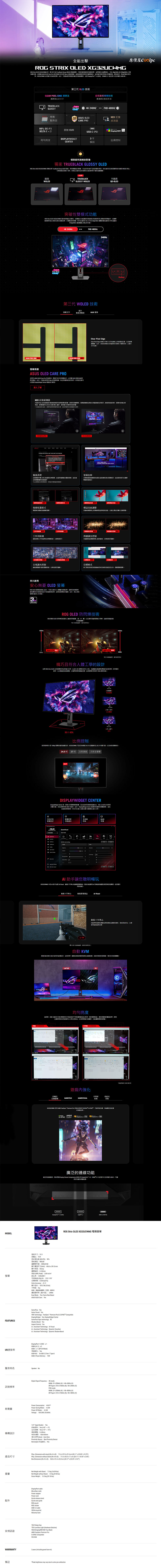 ROG STRIX XG27UCDMG搭載第四代QD-OLED技術,擁有驚人的166PPI像素密度、4K UHD(3840 x 2160)高解析度、99% DCI-P3廣色域、Delta E<2精準色彩、VESA DisplayHDR TRUE BLACK 400認證。而且還有240Hz刷新率,ELMB超低動態模糊,反應時間也只有0.03ms(GTG),並支援VRR可變更新率,NVIDIA G-Sync、AMD FreeSync Premium Pro抗撕裂。I/O提供2x HDMI 2.1、1x DisplayPort 1.4、1x USB-C(DP alt mode)、3x USB3.2 Gen1 Type-A。ROG STRIX XG32UCWMG則是搭載華碩獨家Trueblack Glossy OLED技術,減少多達38%環境反射,32吋的畫面可在4K 240Hz、FHD 480Hz間雙模切換,反應時間僅0.03ms(GTG)!擁有99% DCI-P3色域、Delta E<2色準、VESA DisplayHDR True Black 400認證、KVM切換功能。I/O內建2x HDMI 2.1、1x DisplayPort 1.4、1x USB-C(DP alt mode)、3x USB3.2 Gen1 Type-A。兩台螢幕都搭載ROG AI GAMING技術,AI準心、AI暗場增益、AI Visual、GAMEPLUS、GAMEVISUAL,而且針對面板有ASUS OLED CARE PRO技術保護,內建NEO接近感測器自動偵測螢幕開關,並透過像素清潔、螢幕位移、亮度調整、特製散熱器防止烙印,還有原廠3年保固。