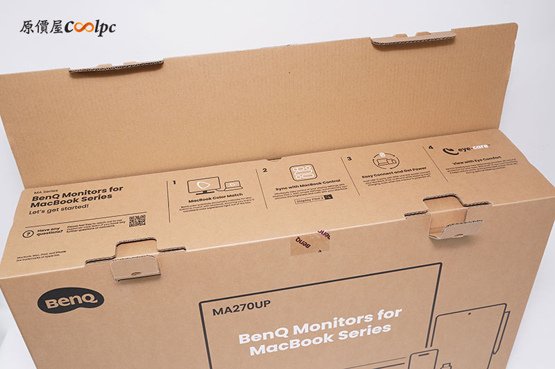 BenQ MA270UP 螢幕專為 apple Mac 生態而生!環保外盒沒有太多花俏的圖案,外盒背面則是螢幕與 apple Macbook 和 iPad、iPhone 示意圖,頂部有螢幕拆裝簡易教學,內部則是特色介紹,像是同步色彩,與 MacBook 控制同步亮度、音效設定,強大的 Hub,輕鬆串聯 USB-C 裝置,還有領先業界的護眼技術來保護眼睛。