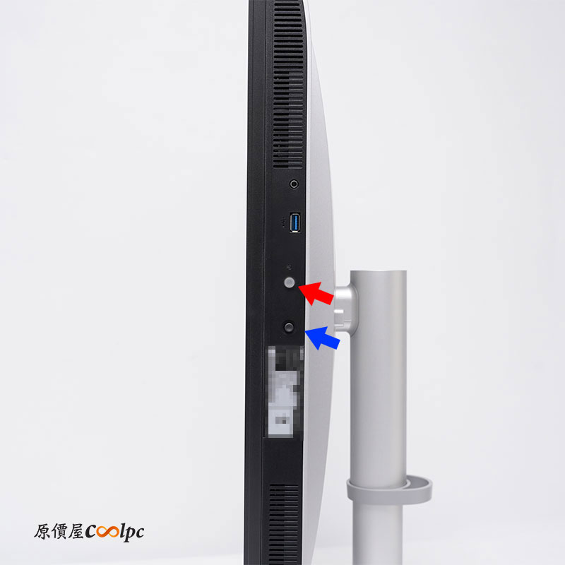 螢幕底下藍色箭頭是是五向控制器,紅色箭頭是電源按鈕和電源 LED 指示燈,旁邊還有一個 USB 3.2 Gen1 Type-A 和 3.5mm 耳機孔。