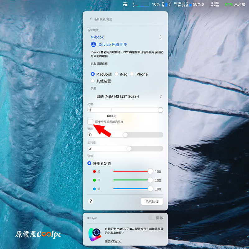 M-book iDevice 色彩同步模式內,可以看到 MacBook、iPad、iPhone、其他裝置,裝置本身會自動抓取 MacBook 筆電參數,若沒有可以自己挑選,底下可以看到是自動同步 macOS ICC 文件,確保顏色統一。