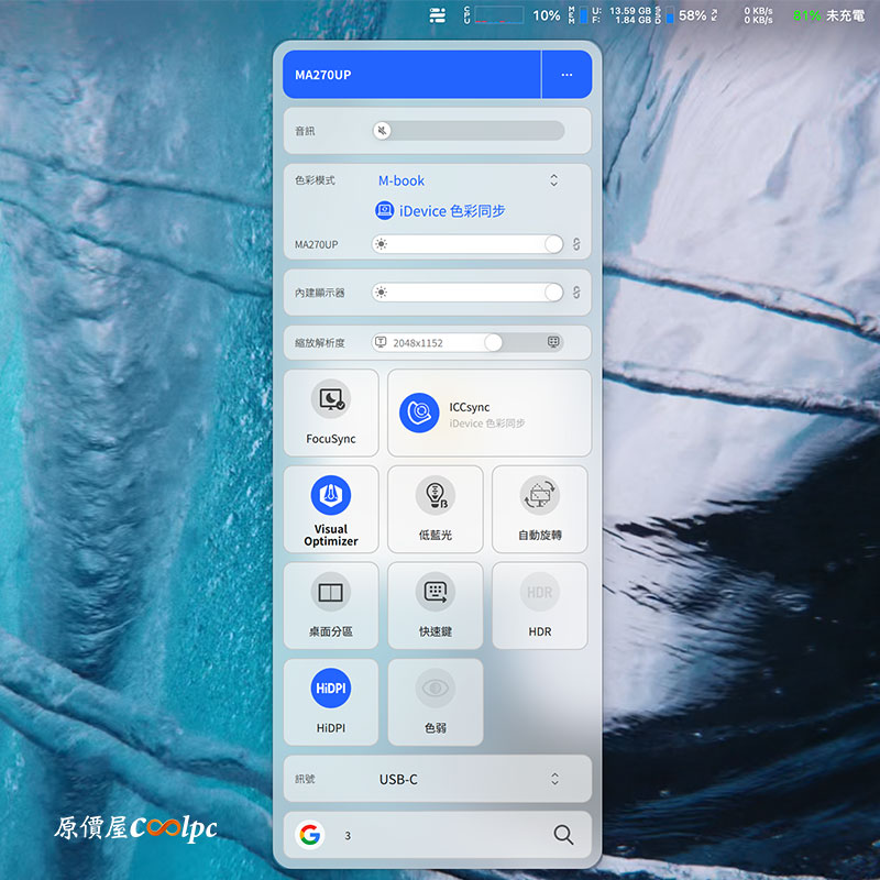 M-book iDevice 色彩同步模式開啟,外接螢幕的色彩幾乎是跟 MacBook 一樣,如果是 Apple Mac 全家統的用戶,真心推薦 Benq MA270UP 鏡面螢幕,體驗上來說真的不錯,只要不是強光直射螢幕,抗反光的效果真的不錯,BenQ MA270UP 鏡面這台也有跟蘋果 Apple Studio Display 比較(點我查看),讓用戶用一半價格可以獲得幾乎一樣的視覺效果,小編個人覺得還蠻值得投資。
