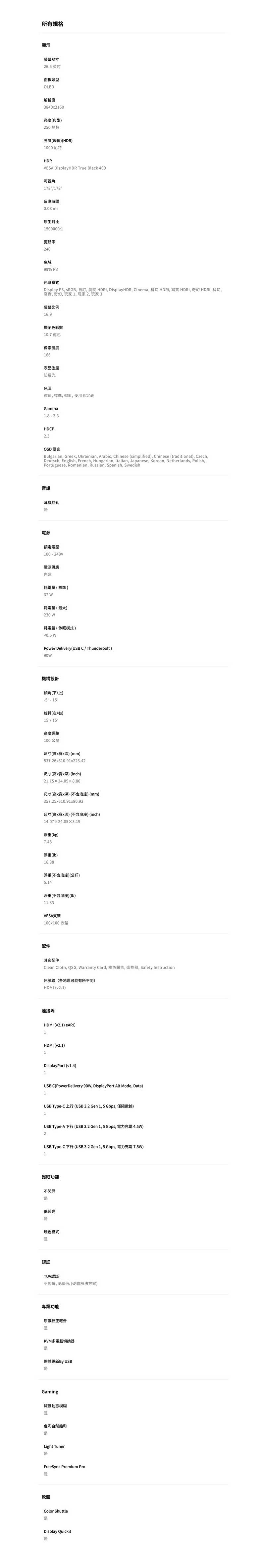 你以為 BenQ MOBIUZ EX271UZ 遊戲護眼螢幕就這樣嗎?不!MOBIUZ 搭載 AI 驅動晶片,且支援 Color Shuttle 軟體,擁有超過 120 組 AAA 大作專屬色彩配置文件(奇幻/科幻/寫實風格一鍵切換),讓 AI 應用、遊戲或 4K 後製從容應對;專屬 FPS 神器如十字準星、FPS 計數器、模糊抑制,搭配 FreeSync Premium Pro 抗撕裂,輕鬆解出勝利方程式。I/O 介面夠豐富:2 x HDMI 2.1(一組含 eARC)、DP 1.4、USB-C(PD 90W 快充 + DP Alt) + USB 5Gbps(2A1C),支援 KVM 多裝置切換,且附贈遙控器,透過 HDMI CEC 技術一遙控統御螢幕與次世代遊戲主機,結合 eARC 高品質音頻回傳 + ALLM 自動低延遲模式 + VRR 變頻率技術,為遊戲帶來極致沉浸感受!螢幕支架支援 100mm 高度升降,支援 VESA 壁掛安裝再加一分。細節把關也不含糊,螢幕皆經過出廠校色!白色機身更是娛樂場所、辦公環境的百搭首選!