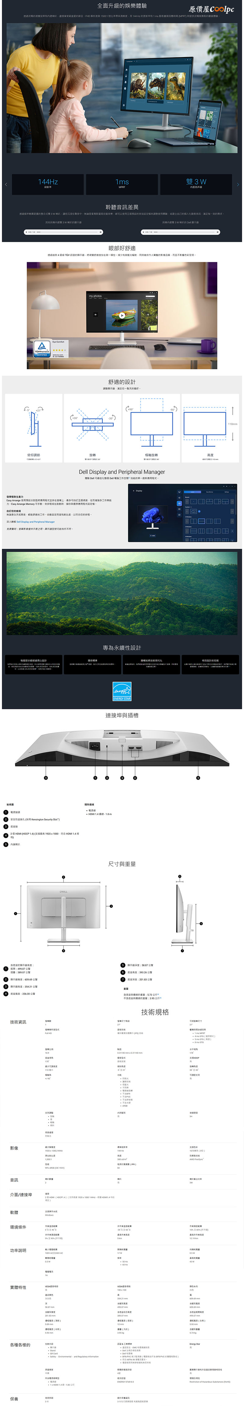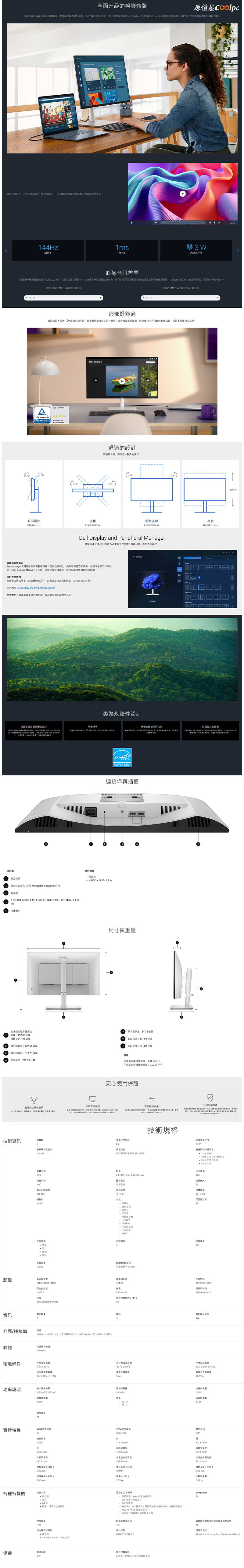 Dell Plus S2425HSM/S2725HSM/S2725DSM/S2725DC 這四台 IPS 螢幕的共同點採用灰白色外觀設計,具備 144Hz 更新率、1ms MPRT、FreeSync 技術、99% sRGB 色域、可升降旋轉、3W 喇叭、VESA 100 x 100 壁掛規格,尺寸的部分只有一台是 24 吋,其他三台都是 27 吋,解析度前兩個型號為 FHD ,後兩個型號為 2K,I/O 輸入介面的部分最少都會有兩個,會需要使用到 Type-C 的話,可以直接挑選 S2725DC 型號,這四台不論是要玩遊戲還是辦公處理使用,個人覺得都挺適合的,就看個人使用習慣或擺放空間來挑選,螢幕台灣還有 3+1 年和無亮點保固,沒什麼好挑剔的了。