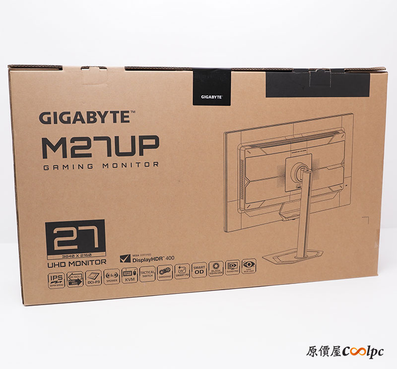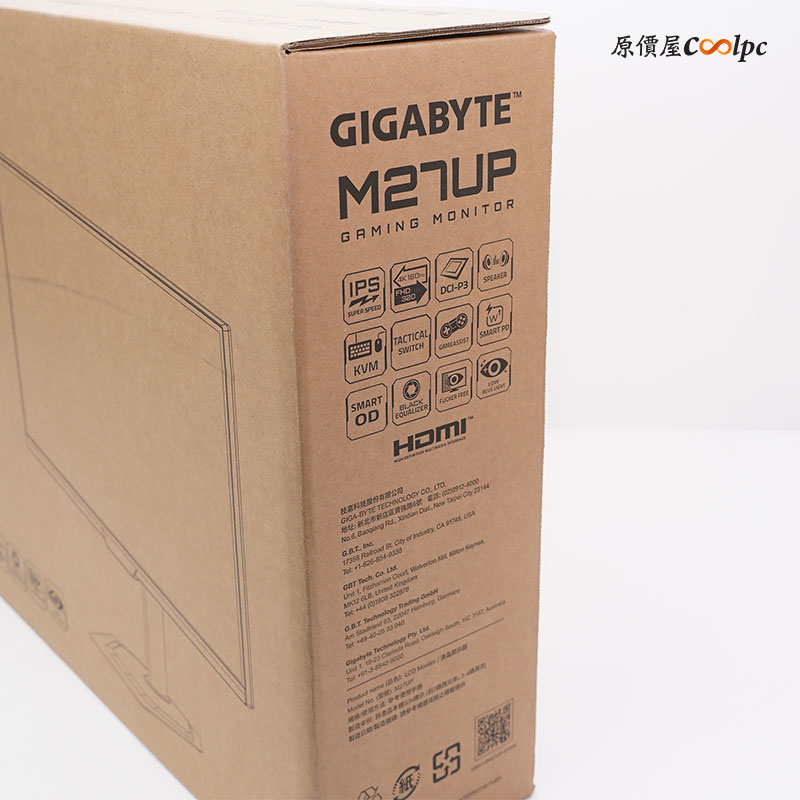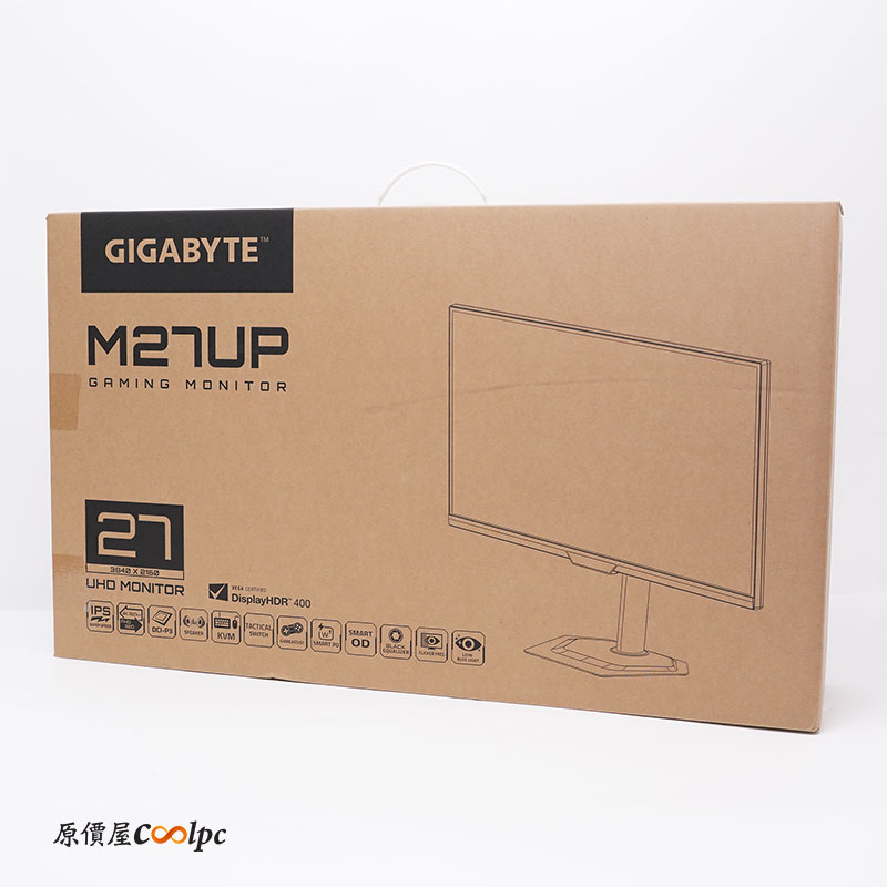 外盒採用可回收環保紙盒設計,左邊可以看到技嘉 LOGO 以及 M27UP 螢幕型號,底下則是簡易規格介紹,右手邊則是螢幕示意圖;外盒背面與前面大同小異,讓你可以看到螢幕正反面的樣貌。