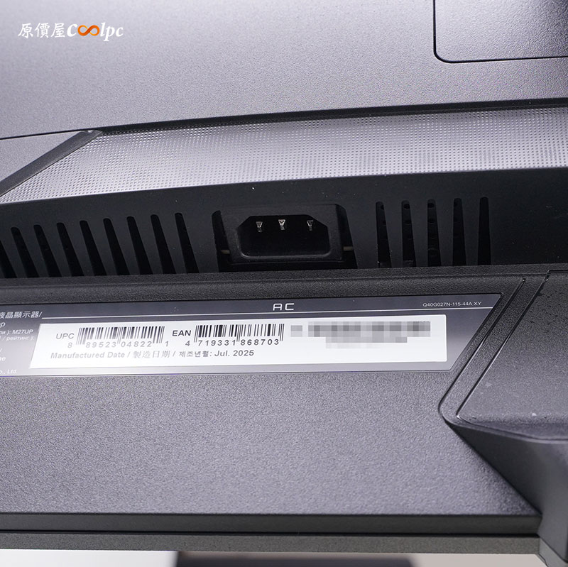 左手邊下方則是供電插孔,底下則是產品 UPC 通用、EAN 歐洲條碼,以及產品序號(馬賽克的地方),還有製造日期。