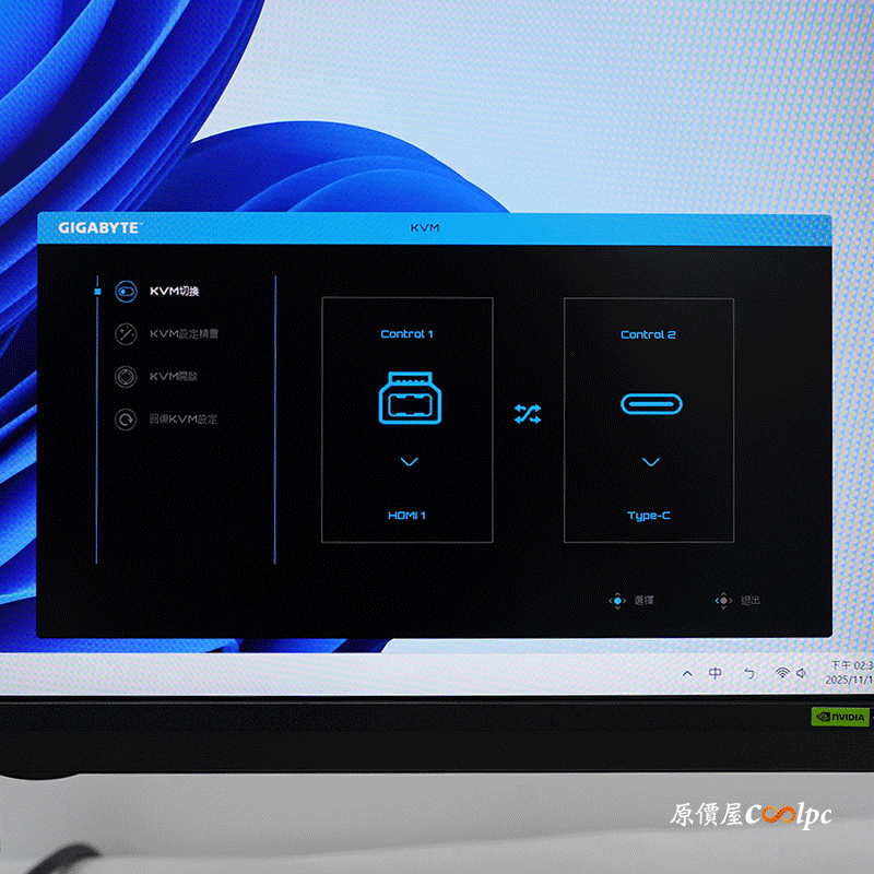 螢幕的控制按鈕設計在正下方,左右兩邊還有分別的快速鍵功能,左邊是 KVM 功能切換,右邊是 4K@160Hz/FHD@320Hz 快速切換按鈕。正中間的按鈕除了開關機功能之外,上下左右也皆有快捷功能,稍後會有介紹。