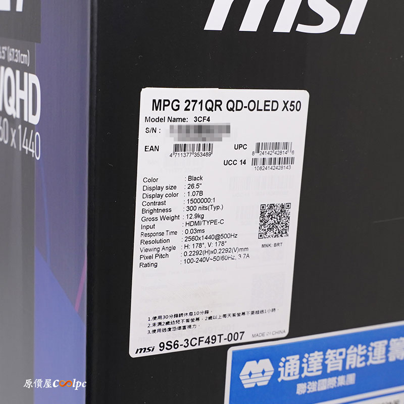 彩盒外包裝,正、反兩面皆有螢幕實體示意圖,型號是 MPG 271QR QD-OLED X50,尺寸是 27 吋 WQHD (2560×1440)解析度,側面的標籤貼紙除了有螢幕的 S/N碼資訊外,還有簡易的規格介紹。