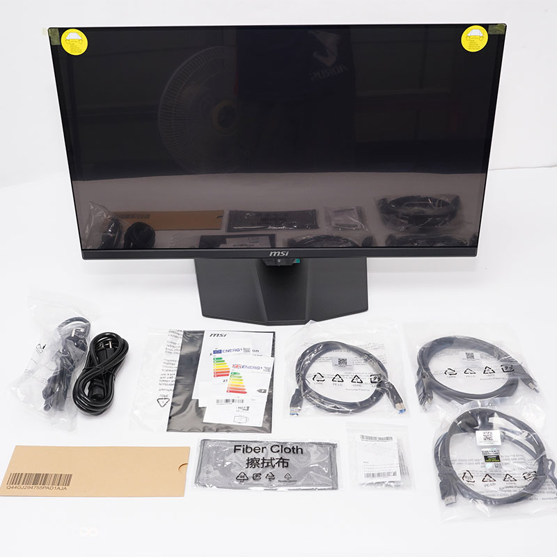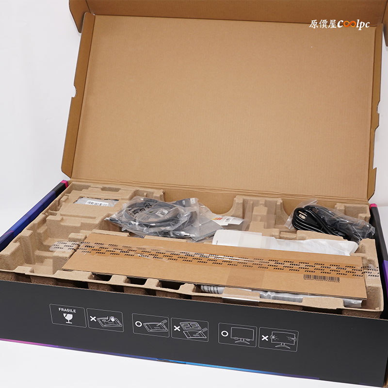 螢幕外箱採用平躺式開箱方式,與先前抽取方式不一樣,可以有效降低螢幕意外損傷,外盒外側有印上注意安裝事項;內容物有螢幕本體,兩條電源線、安裝指南、USB Type-B 連接埠(KVM用)、DisplayPort 2.1 線材、色彩校正證書、擦拭布、螢幕壁掛專用螺絲、HDMI 2.1 線材,內附的 DisplayPort 2.1 線材是滿血 80Gbps 版本。