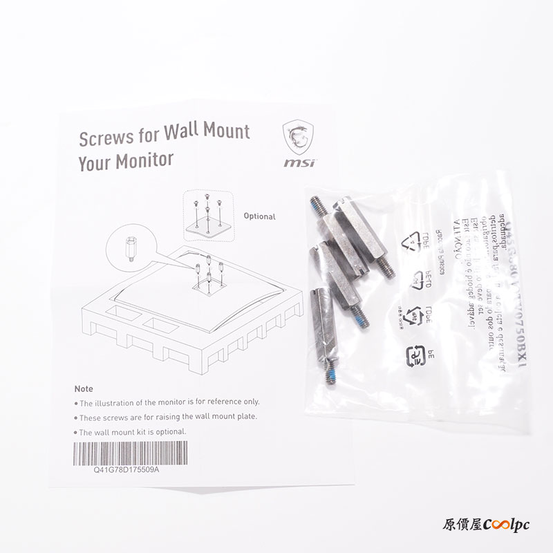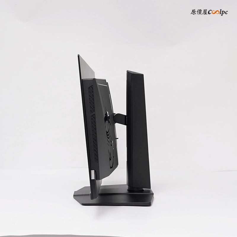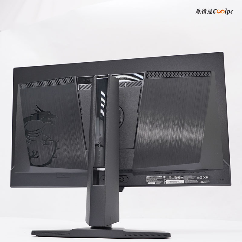 螢幕背面的部分也相當有個性,左右兩邊採用髮絲紋設計,還有一個龍魂的 LOGO,頂部還有通風孔。不想安裝支架也有提供 VESA 100 x 100 mm 掛壁安裝,記得必須使用內附的延長螺絲。