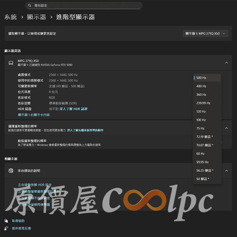 螢幕內的資訊,可以確定顯示的是 2560 x 1440 解析度,500 Hz 刷新率。