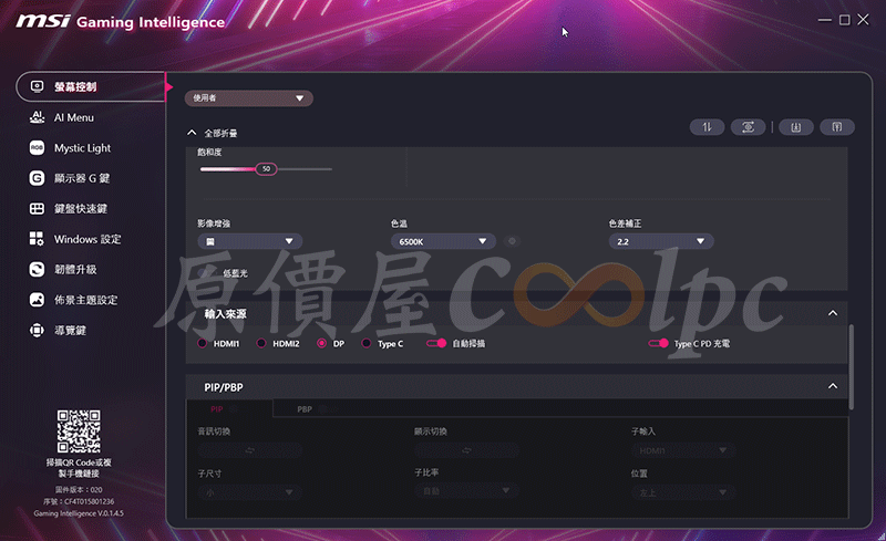 如果不想用按的,可以到官網下載 Gaming Intelligence 軟體(點我前往),可以透過滑鼠直接調整螢幕設定,甚至還可以掃描左下角的 QR Code,透過手機來設定也不是問題。