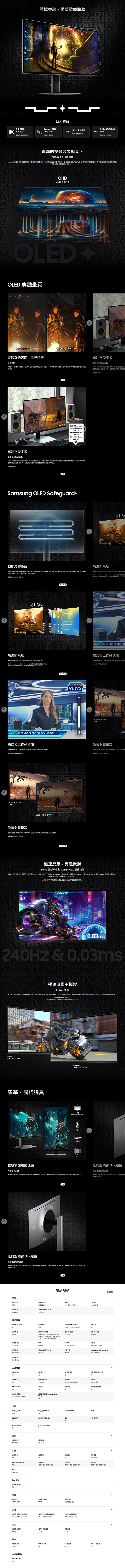 這台螢幕最令人驚艷的地方,就是那塊頂級的 QD-OLED 面板。不同於傳統螢幕總有一層揮之不去的背光感,它能呈現極致的純黑,讓畫面更有層次;不論是金屬的冷冽光澤,還是陽光灑下的細膩紋理,畫面裡的物件都真實得彷彿擺在指尖,觸手可及。在性能表現上,240Hz 更新率配合極速 0.03ms (GtG) 反應時間更是旗艦水準,完全消滅了惱人的殘影與延遲。再加上專為 OLED 設計的 OLED Safeguard+ 散熱技術,不只畫面漂亮,更耐用可靠,讓你不再擔心烙印問題!外觀採用全金屬感設計與超纖薄機身,搭配後方的氣氛背光燈效,電競氛圍直接拉滿。同時它還支援 HDMI 2.1,不論接電腦還是遊戲主機,都能提供滿滿的視聽饗宴。趁著這波五千元的超大降幅,趕快告別灰暗的視覺體驗,給自己一個全新的視界吧!