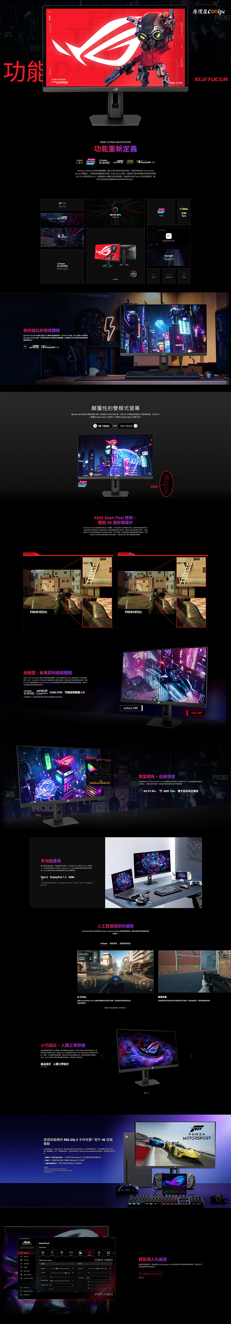 ROG Strix XG27UCGR Gen2 這兩台電競螢幕採用 27 吋 Fast IPS 面板,具備 4K 162Hz 或 FHD 485Hz 雙模切換功能,提供 95% DCI-P3 與 130% sRGB 廣色域,出廠還有色彩校正保證,並支援 VESA DisplayHDR 400 認證。除了獨家 Smart Pixel 智慧影像提升與 ELMB-SYNC 防破圖技術外,更內建 AI 遊戲強化功能,像是 AI Visual、動態準星與暗場增益功能,全方位輔助玩家贏得勝利!連接介面有 HDMI 2.1 (支援 PS5 / Xbox 的 4K@120Hz)、DisplayPort 1.4,以及支援影音傳輸與供電的 USB Type-C,還有符合人體工學設計的支架,可傾斜、旋轉、左右轉動和高度調整,確保觀賞體驗可以達到最佳化,歡迎有興趣的朋友可以利用網路下單,或到門市做詢問,或利用蝦皮商城下單囉。