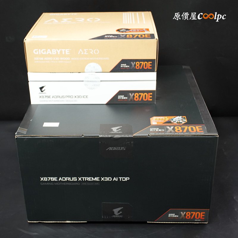 看看主機板外盒,依序是技嘉 X870E AERO X3D WOOD>X870E AORUS PRO X3D ICE>X870E AORUS XTREME X3D AI TOP,最巨大的就是 AI TOP 這款。這個體型太扯,但小編要放到後面再開箱。