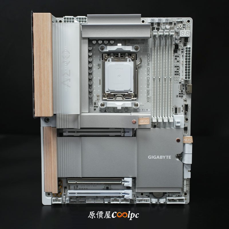 從這角度不僅可以更清楚觀察到 I/O 護罩的木紋飾板細節,還能看見圍繞著 AM5(LGA1718)插槽的大面積散熱裝甲,技嘉 X870E AERO X3D WOOD 採用 16+2+2 相數位供電設計,以及 8 層伺服器等級 PCB,強化信號完整性,Socket AM5 可支援 Ryzen 9000/8000/7000 處理器,即便搭載頂級的 Ryzen 9 9950X 或最新的 X3D 處理器,在高負載渲染或長時間運算下也能維持電壓的高度穩定。