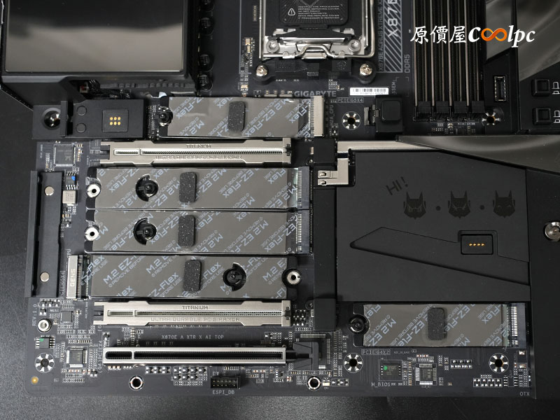 (點小圖放大)技嘉 X870E AORUS XTREME X3D AI TOP 主機板在外觀展現了頂級旗艦的黑金美學,全板由大面積的深黑色金屬散熱裝甲覆蓋,並搭載醒目的 5 吋 Edge View 全彩 LCD 螢幕,能即時監控系統參數或顯示自定義動畫。主板提供 24+2+2 相數位供電與雙 8-pin UD 電源連接器,完美駕馭 AMD Ryzen 9000 全系列或未來的 X3D 系列處理器。記憶體提供 4 x DIMM DDR5 雙通道插槽(Memory UD Slot D5 強化),最高支援 DDR5 9000+ MT/s(OC);2 x SATA 6Gb/s 插座並支援 RAID 0 / 1;擁有 2 組具備 PCIe UD Slot X 強化的 PCIe 5.0 x16 插槽(支援 x16 或 x8/x8 模式)、1 組裝甲強化 PCIe 4.0 x16(x4) 插槽,PCIe 5.0 x16 插槽具備 PCIe EZ-Latch Plus Duo 快拆設計,一鍵釋放顯卡卡扣。共提供 5 組 M.2 插槽(最高支援 2 x PCIe 5.0 x4)與 M.2 EZ-Latch Click 與 M.2 EZ-Latch Plus 免螺絲快拆設計,搭配巨型 M.2 Thermal Guard Xtreme 散熱裝甲,徹底發揮 PCIe 5.0 儲存效能。