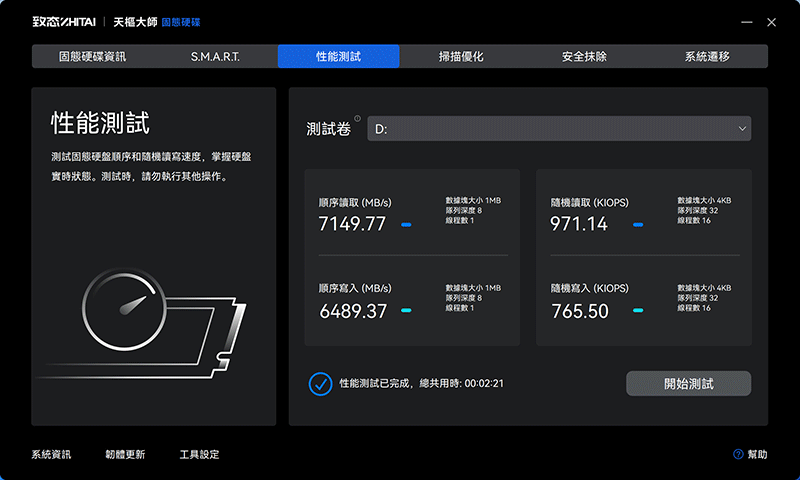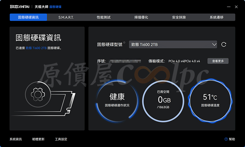 致態有開發自家天樞大師軟體,可以用來檢測 SSD 和查看即時資訊,項目有固態硬碟資訊、S.M.A.R.T、性能測試、掃描優化、安全抹除、系統遷移;左下則是有系統資訊,韌體更新、工具設定等。