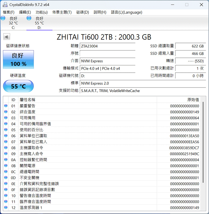 使用 CrystalDiskInfo 軟體,沒有安裝主機板散熱片下,待機溫度是 55 度,滿載寫入高達 70 度,如果主機板沒有散熱裝甲的話,建議購買一個散熱裝置,才不會因溫度而降低讀寫效率。