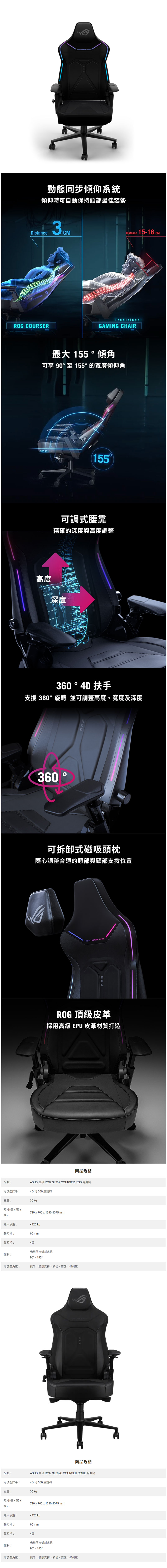 這回活動一共有兩種款式的電競椅,其中一張是純粹性能派,低調但超能打的「ASUS ROG SL302C Courser CORE 電競椅」。價格為 $19900,如果你是那種不需要花俏,但要舒服到可以連坐八小時的玩家朋友,那 Courser CORE 絕對會正中你的心!整體設計走的是 ROG 經典戰術風格,線條俐落、外型硬派,但真正厲害的都藏在細節裡。高密度冷泡成型泡棉,久坐不塌、支撐夠硬,符合人體工學的椅背曲線,能自然貼合背部,減少長時間對脊椎與腰部的負擔。再搭配可調式扶手、椅背後仰機構,不管是認真打 Rank、剪片、開會,還是中途小躺回血,都能找到最舒服的位置。這張椅子就是一種感覺:坐下去,你會忘記時間啊!再來,就是專業狂熱玩家的首選~可說是戰位信仰值直接點滿!「ASUS ROG SL302 Courser RGB 電競椅」,價格 $24900,如果你覺得電競椅沒有 RGB 就像鍵盤沒燈,那 Courser RGB 就是專為你準備的~在 Courser 系列頂規版本當中,ROG 把品牌靈魂直接灌進椅子裡,可發光的 ROG RGB 燈效系統,低調嵌入設計,不浮誇,但一亮就知道是主角!同樣具備頂級人體工學結構與高品質材質,舒適度與支撐性全面到位,再加上 RGB 氛圍燈效,直接把你的電競房升級成直播間等級。晚上開機那一刻,你不是準備打遊戲,你是在沉浸戰鬥模式。這回新上市就加碼!「ROG Cosmic II 地墊」直接送了~只要入手兩張電競椅任一張,上市優惠期間內購買,你就有機會拿的到!地墊不只是防刮,更是整個戰位的完成拼圖。滑順移動、穩定止滑,讓你的電競椅移動不卡、不傷地板,整體視覺一致性也直接拉滿呢!