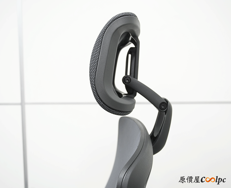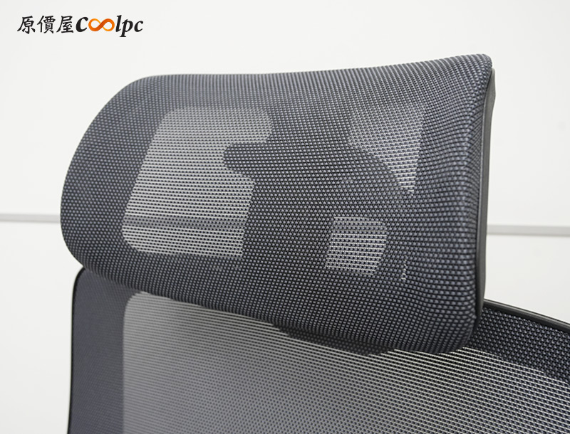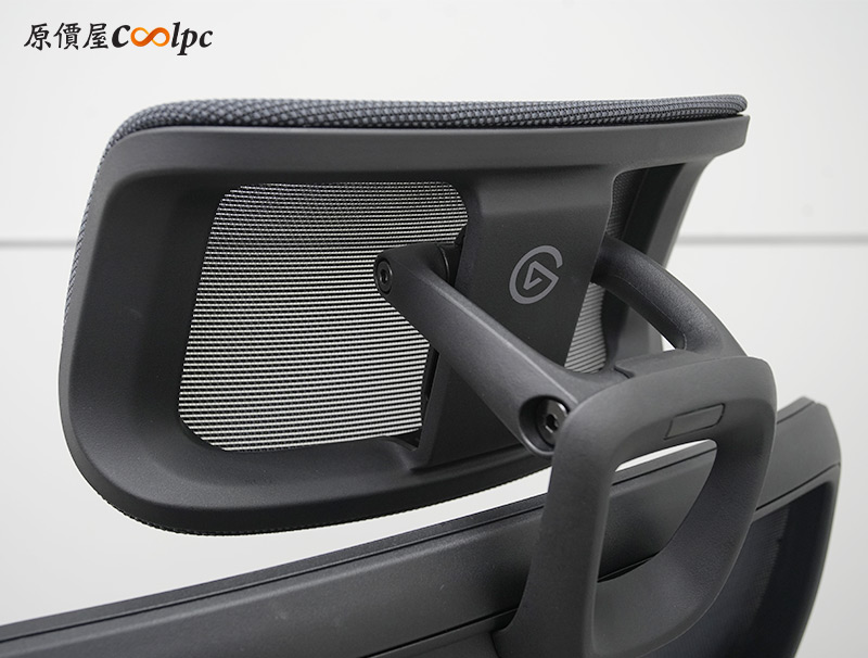 頭枕上的曲面可以更完整支撐頸部,網布材質避免熱能堆積,後方還可以看到ELGATO標誌,小小一個非常低調。這也是為了符合椅子外觀的設計理念,沒有浮誇大LOGO,只有強調機能實力。