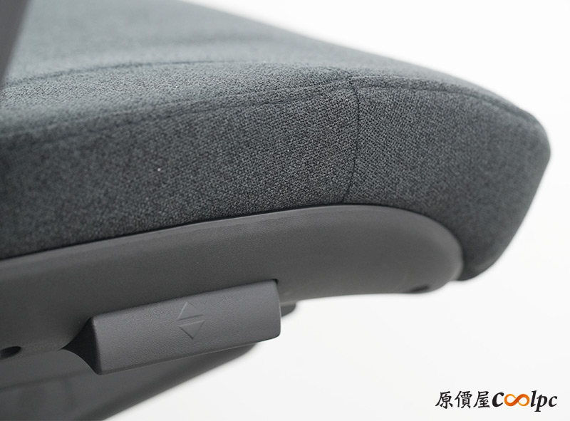 左右扶手也是符合人體工學,扶手表面左右高起,更貼近手臂的形狀,而且調整高低的按鈕在下方,這點倒是挺特別。