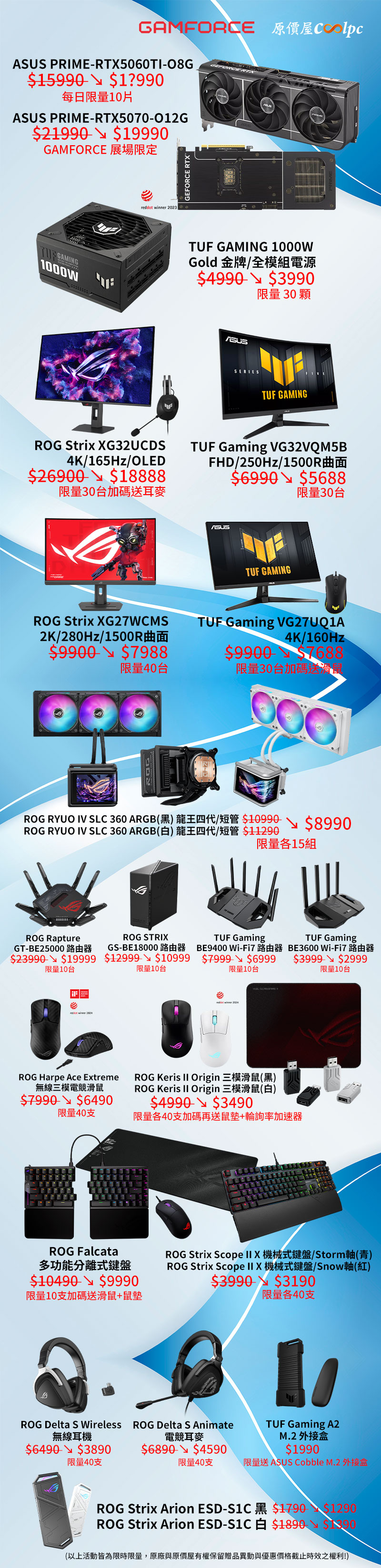 年度壓軸最大擋優惠千萬不能錯過!2025 GAMFORCE 電競嘉年華將在 12月18日-12月21日於台北華山舉辦,首日(18號周四)為 YoungDay 專屬學生們的一天,必須攜帶學生證才能入場!原價屋與 XFastest 身為主辦單位,今年也幫幫各位集結眾廠商一起放福利啦(看懶人包)!今天帶來華碩最熱門也最划算 RTX 5070/5060 TI 8G 顯卡,展場限定 $19990/ $1?990 元,趁著顯卡還沒因記憶體顆粒而調漲價格趕緊入手,把握機會只有這四天啊!除了顯卡促銷之外,也有很多電競周邊同步促銷,像是 TUF GAMING 1000W 全模組電源供應器四千塊有找,ROG 分離式磁軸電競鍵盤免萬再送滑鼠+鼠墊,華碩 TUF Gaming A2 20Gbps M.2 外接盒只要 $1990,加碼再送 ASUS Cobble 10Gbps M.2 外接盒買一送一也太浮誇了!還有眾多華碩周邊下殺,小編把它列在下方!有興趣的朋友,歡迎前往展場選購,商品限量售完為止。