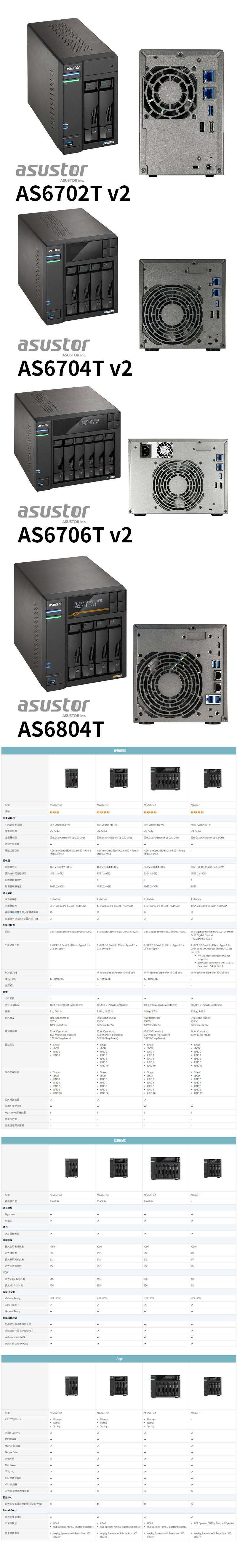 今年華芸提供的機種一樣相當有誠意,從入門到高階一次全包!這次的四台 NAS 裡,AS6702T v2、AS6704T v2、AS6706T v2 這三款都採用 Intel N5105 四核心處理器,並預先安裝 4GB / 8GB SO-DIMM DDR4 記憶體。三者主要差別在於擴充性與硬碟數量不同,除了都支援 4 組 M.2 PCIe 3.0 SSD 之外,也提供 2Bay、4Bay、6Bay 不同容量配置,大家只要照自己的需求挑就好。I/O 部分也相當齊全:2× 5GbE 連接埠、2× USB 3.2 Gen2 (10Gbps)、1× USB 2.0、以及 HDMI 2.0b,不論拿來做個人雲端、工作室資料庫、影音伺服器、監控錄影站都很夠力。