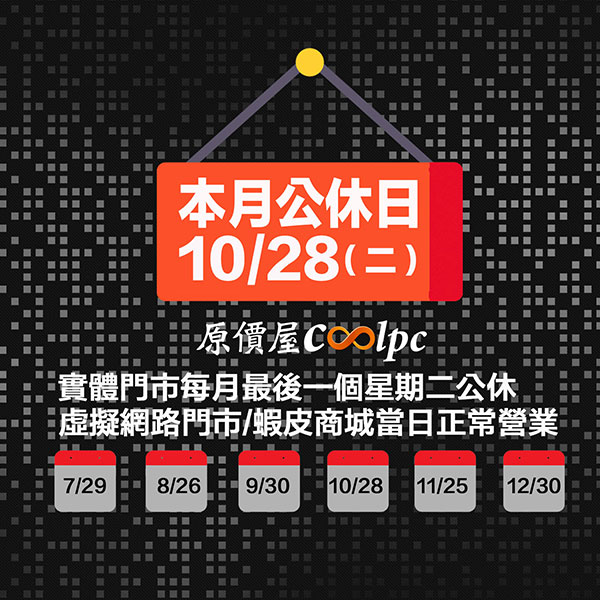 本年度起,原價屋每月新增多一個公休日,排定時間與光華商場相同,皆為每個月最後一個星期二,實體通路公休一日不營業,惟虛擬通路無休仍正常運作,造成不便之處請見諒,有需求也歡迎多加利用原價屋線上估價系統原價屋蝦皮商城下單,謝謝。