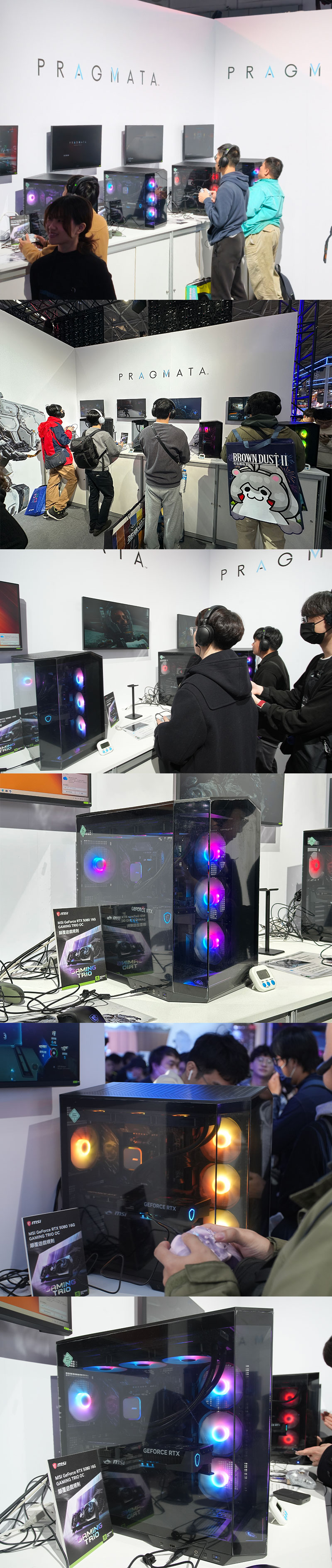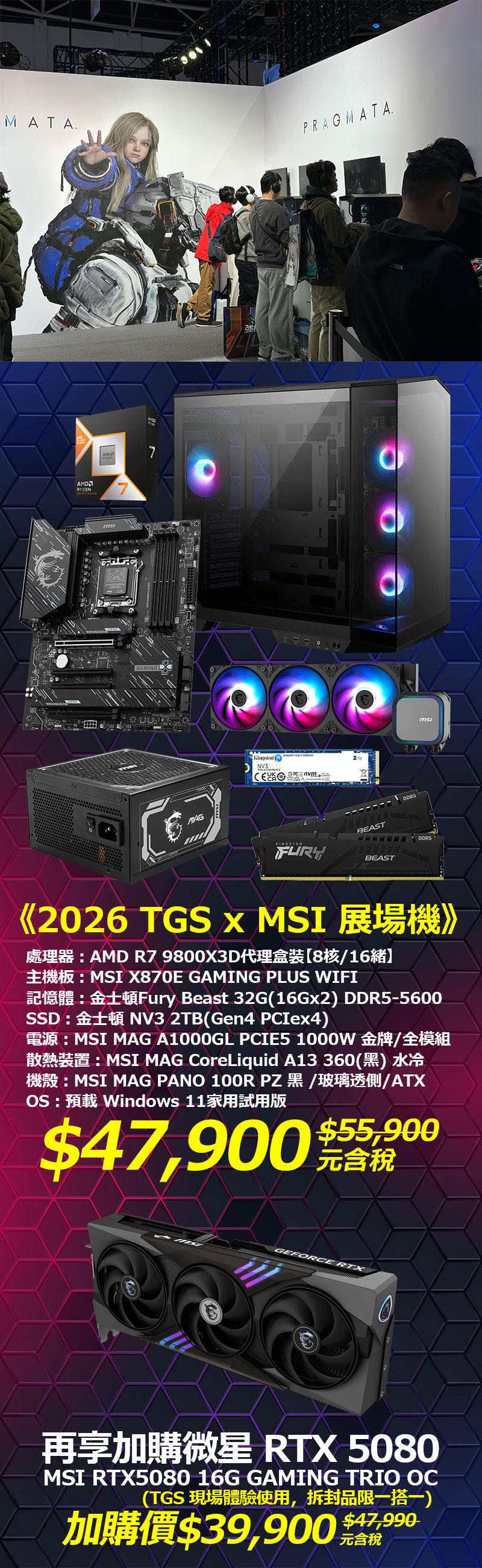 現場展示體驗 2026 TGS《微星》展場機是以微星 MSI X870E GAMING PLUS WIFI 與微星 MAG PANO 100R PZ 黑海景房機殼為底,270 度全景視野,配上零件的 ARGB 燈效,更有電競風味,搭配的規格更是出色,採用遊戲玩家指定率最高的 AMD Ryzen 7 9800X3D 8核/16緒處理器!配上 MSI MAG CoreLiquid A13 360 一體式水冷,全覆蓋銅底座與高效能幫浦,完美釋放 CPU 效能。加購顯示卡則是 MSI RTX5080 16G GAMING TRIO OC,擁有 DLSS 4 黑科技加持,3A 大作 4K 光追輕鬆暢玩!而且它的 AI 算力高達 1801 TOPs,跑生成式 AI 繪圖、14B LLM 模型都能輕鬆駕馭。記憶體方面配上 32GB(16GB x 2) D5-5600MHz,M.2 SSD 也有 2TB 容量,讀寫速度高達 6000/5000 MB/s,別說是日常應用,拿來辦公、影像剪輯都綽綽有餘了,其他還有像是有 5GbE有線、WiFi 7 無線、USB4、PCIe5.0 等介面滿足高速需求。MAG PANO 100R PZ 海景房機殼還搭載 4 顆(3 側 1 後) ARGB 風扇和一體式水冷的風扇共有 7 顆,散熱效果一級棒!