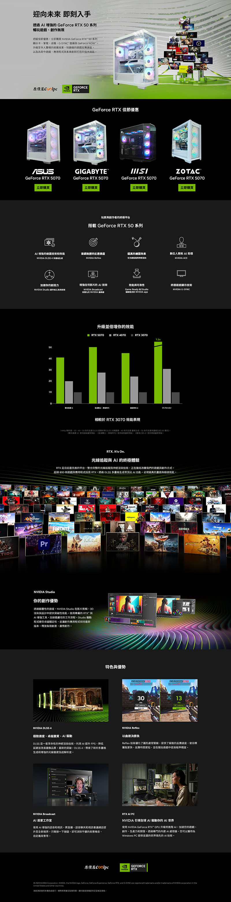 在這個「人人瘋 AI」的時代,NVIDIA GeForce RTX 50 系列顯示卡已經成為您跨足 AAA 遊戲 和 AI 尖端應用的神兵利器!趁著年末佳節時分,NVIDIA 再次攜手原價屋,集結華碩 ASUS、技嘉 GIGABYTE、微星 MSI、索泰 ZOTAC 等各大品牌強勢推出 RTX AI PC!讓您輕鬆駕馭 NVIDIA DLSS 遊戲 AI、Stable Diffusion / ComfyUI AI 創作工具,更有 NVIDIA NIM 企業級 AI 加速應用,以及 NVIDIA Broadcast 日常 AI 技術!現在就升級,除了享受 AI 加速帶來的遊戲 & 創作效率的全面提升,同時也能把電競周邊抱回家!