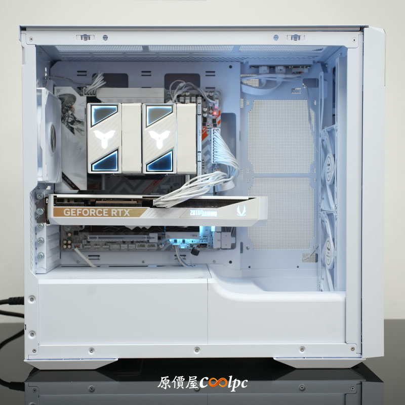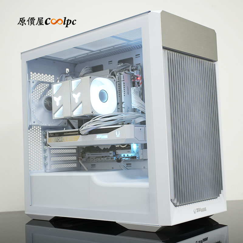 * 索泰 ALLOY 白色機殼 + darkFlash PMT 850W 白色電源:機殼面板採用白色柵欄設計,搭配上方銀色絲紋飾板,不僅美觀更兼顧大面積進氣,內層配備可快拆清洗的防塵濾網,確保內部組件遠離灰塵侵擾。側邊搭載全景玻璃透側,將內部潔白俐落的硬體如藝術品般完整展現。電源通過 80 PLUS 金牌認證,穩定輸出有保障!支援全新 ATX3.1 及 PCIe 5.1 規格。全模組化設計讓內部整潔有序的同時,也能降低散熱受阻並提升排熱效率。