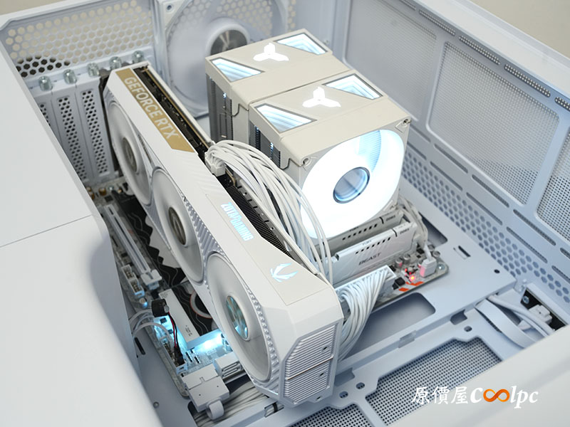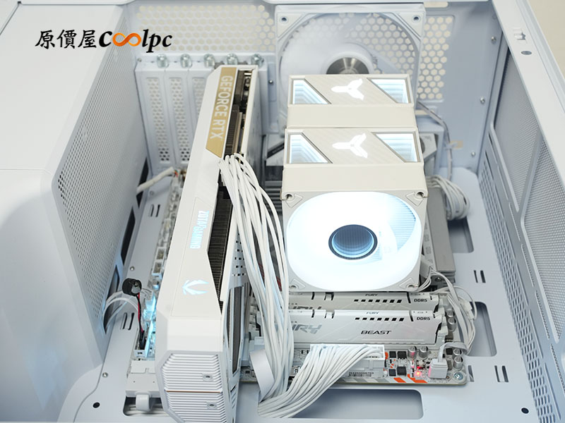 AMD Ryzen™ 7 9800X3D + 雙塔雙扇散熱器:唯一選擇眾人推薦的最佳遊戲處理器,搭載 3D V-Cache 技術,像《魔獸世界》這類 MMORPG,更能有效提升複雜場景下的流暢度。無論是在主城待命或參與大規模區域事件,都能體現出色且穩定的 1% Low FPS。搭配喬思伯 CR1400 DV2 白色散熱器,雙塔雙扇架構配合 6 根熱導管,強力壓制 9800X3D 廢熱。白色系塗裝與幻彩燈效相輔相成,彷彿在至暗之夜中守護艾澤拉斯的一盞聖光,確保主機在高負載下依然維持優異的遊戲表現!